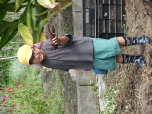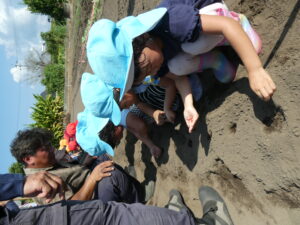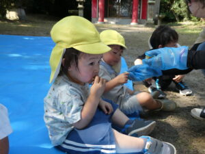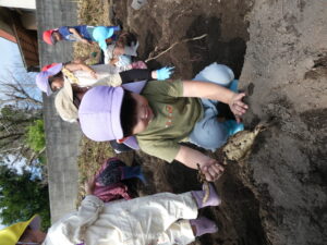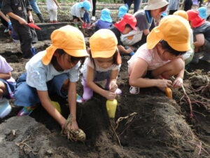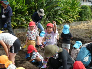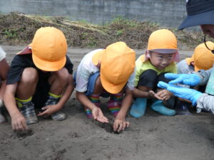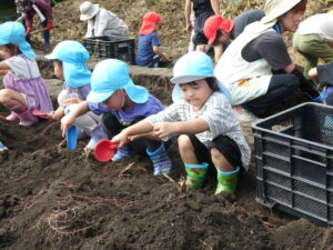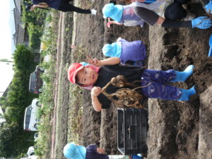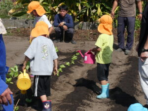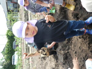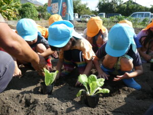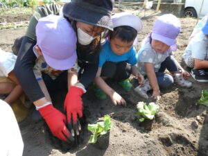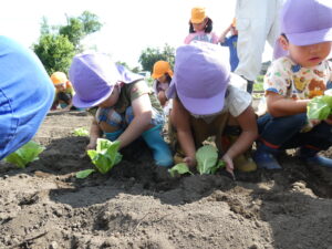 3歳児さんも穴を掘って白菜の苗を植えました♪